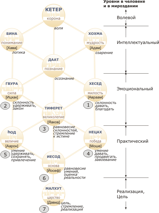 Как известно, одна из центральных идей Каббалы состоит в том, что универсальная структура «Десяти сфирот» проецируется на все уровни жизни – на порядок и структуру Сотворения мира, на праотцов и создателей еврейского народа, на устройство души человека, на структуру еврейского национального общества и т.д. То есть структура сфирот проявляется повсюду, и выявление этой общей структуры помогает нам увидеть единство мироздания, что является одной из важнейших вещей в Каббале (как и во всякой мистике).
